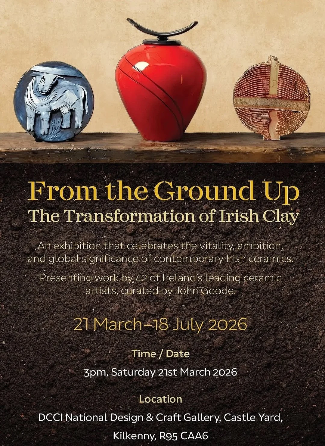 This exhibition celebrates technical mastery and innovation, as well as the powerful narratives embedded in clay. Through their work, artists evoke landscape and language, heritage and experimentation, memory, identity, and transformation. Grounded in Irish earth yet open to the world, *From the Ground Up* affirms Ireland’s dynamic place in contemporary ceramics—honouring clay as an ancient medium continually renewed by the imagination of today’s makers.