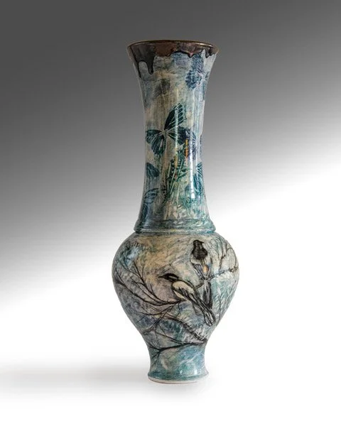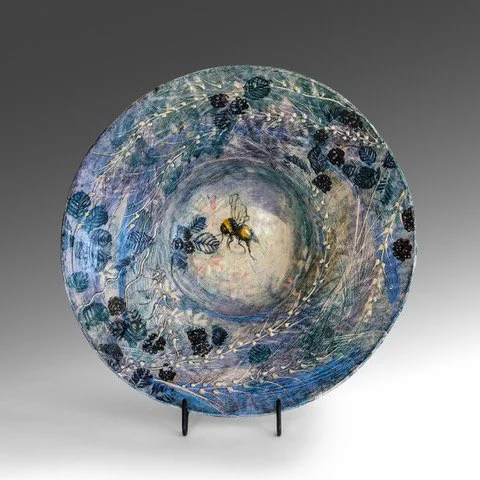 Sally is a ceramic artist with over thirty years experience. In the 1990’s she apprenticed with various potteries in West Cork. She then completed the Thomastown Pottery Skills Training with the Design and Crafts Council Of Ireland. After graduating in 1995 she set up a small studio in West Cork where she still lives and continues to learn, grow and develop as an artist. Sally is also an accredited Psychotherapist. Her ceramic work is highly decorative, multi layered with textured surfaces and hand drawn images. Each piece is wheel thrown or hand built, decorated and finished with a light patina.